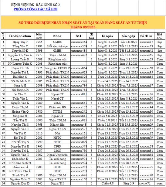 Chương trình Ngân hàng Suất ăn từ thiện của Bệnh viện Đa khoa Bắc Ninh số 2 luôn nhận được sự quan tâm, đồng hành của các nhà hảo tâm, qua đó góp phần hỗ trợ thiết thực cho bệnh nhân có hoàn cảnh khó khăn trong quá trình điều trị. Không chỉ giúp giảm bớt chi phí sinh hoạt, chương trình còn mang ý nghĩa động viên, tạo thêm điều kiện để người bệnh yên tâm điều trị. Trong thời gian tới, Phòng Công tác xã hội sẽ tiếp tục phối hợp duy trì và phát triển hoạt động, tăng cường kết nối nguồn lực xã hội nhằm mở rộng phạm vi hỗ trợ, góp phần xây dựng môi trường bệnh viện nhân văn, nghĩa tình.