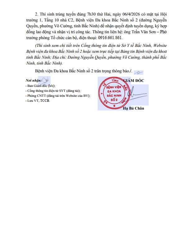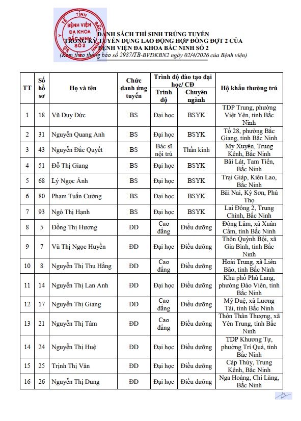 THÔNG BÁO KẾT QUẢ TUYỂN DỤNG LAO ĐỘNG HỢP ĐỒNG ĐỢT 2 NĂM 2026 CỦA BỆNH VIỆN ĐA KHOA BẮC NINH SỐ 2