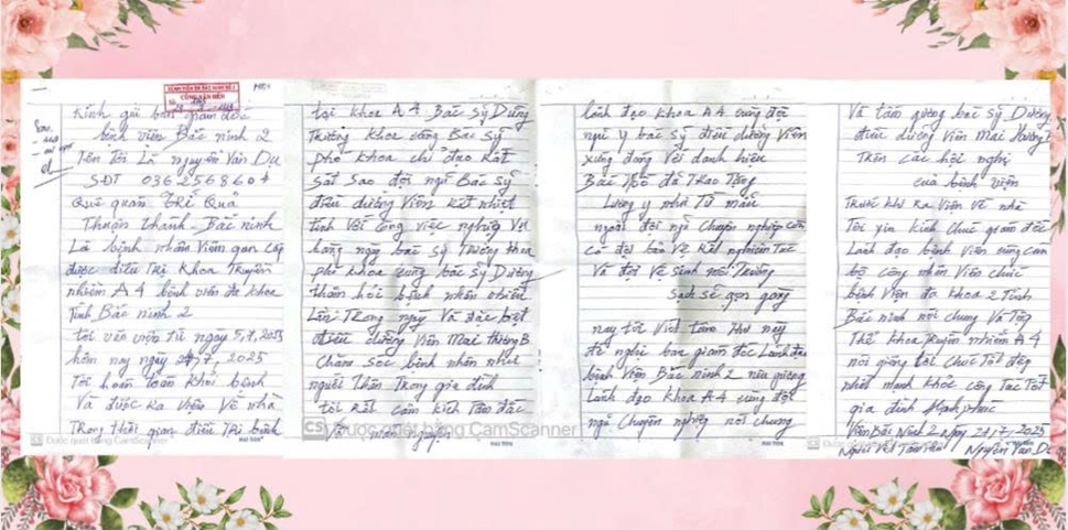 Ông Nguyễn Văn Dự là bệnh nhân điều trị viêm gan cấp tính tại Khoa Truyền nhiễm từ ngày 5/7/2025 và đã hoàn toàn khỏi bệnh, xuất viện vào ngày 24/7/2025. Trong thư, ông bày tỏ lòng biết ơn sâu sắc tới tập thể y bác sĩ và điều dưỡng tại khoa đã điều trị, chăm sóc tận tình, chu đáo trong suốt quá trình nằm viện.