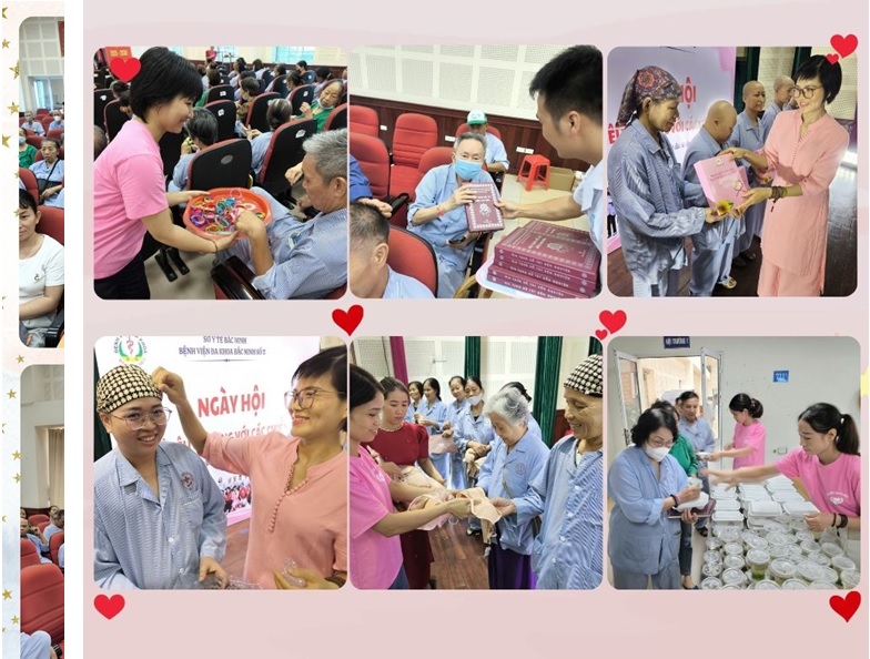 Trong khuôn khổ chương trình, với sự thấu hiểu sâu sắc những khó khăn, mặc cảm và nhu cầu thiết thực của các bệnh nhân ung thư – những “chiến binh K” kiên cường, Phòng Công tác xã hội cùng các nhà hảo tâm đã trân trọng gửi tặng tóc giả, áo ngực chuyên dụng, mũ đội đầu, vòng đeo tay bình an và những suất ăn miễn phí. Những món quà ấy không chỉ là vật dụng hỗ trợ, mà còn là kết tinh của tình thương và sự sẻ chia được chuẩn bị bằng tất cả sự nâng niu, ân cần. Mỗi món quà như mang theo hơi ấm của trái tim, như lời thì thầm dịu dàng: “Chúng ta cùng nhau sống - Bạn không hề đơn độc”. Chính nguồn yêu thương đã hóa thành sức mạnh, tiếp thêm niềm tin để người bệnh vững vàng hơn trên hành trình điều trị – biến ngày hội thành một không gian chan chứa niềm tin, nghị lực và những trái tim đồng cảm.
