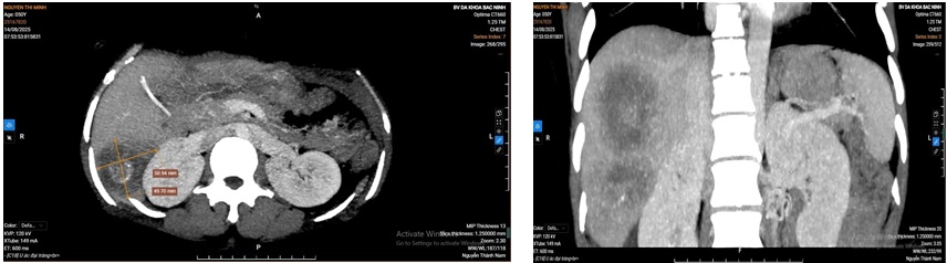 Ngày 11/8/2025, bệnh nhân tái nhập viện tại khoa Ngoại Ung bướu, hình ảnh chụp CLVT bụng và ngực cho thấy bệnh nhân có hai khối u ở gan phải và xuất hiện thêm một khối nhỏ ở gan trái (HPT 3). Đánh giá thể tích gan cho thấy: gan toàn bộ 1390 cm³, gan trái 614 cm³, cân nặng bệnh nhân 43 kg. Sau hội chẩn toàn viện, đã được thống nhất chẩn đoán: Ung thư gan phải ( do ung thư đại tràng di căn gan) kèm khối di căn HPT 3 gan trái/ đã cắt đại tràng phải vét hạch/ đã truyền hoá chất, chức năng gan trong giới hạn bình thường, kết quả đo thể tích gan thấy đáp ứng được phẫu thuật cắt gan phải. Bệnh nhân đã được chỉ định cắt gan phải, lấy nhân di căn HPT 3 gan trái.