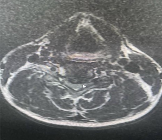 Qua thăm khám, các bác sĩ khoa Phẫu thuật Thần kinh Lồng ngực ghi nhận cơ lực hai tay giảm còn 4/5, kèm theo dấu hiệu chèn ép rễ thần kinh cổ. Hình ảnh cộng hưởng từ (MRI) cột sống cổ cho thấy khối thoát vị đĩa đệm cột sống cổ tầng C4–C5, khối thoát vị gây chèn ép thần kinh, phù hợp với biểu hiện lâm sàng của người bệnh.