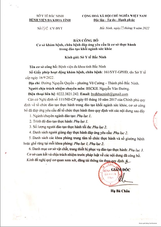 BẢN CÔNG BỐ: Cơ sở khám bênh, chữa bệnh đáp ứng yêu cầu là cơ sở thực hành trong đào tạo khối ngành sức khoẻ