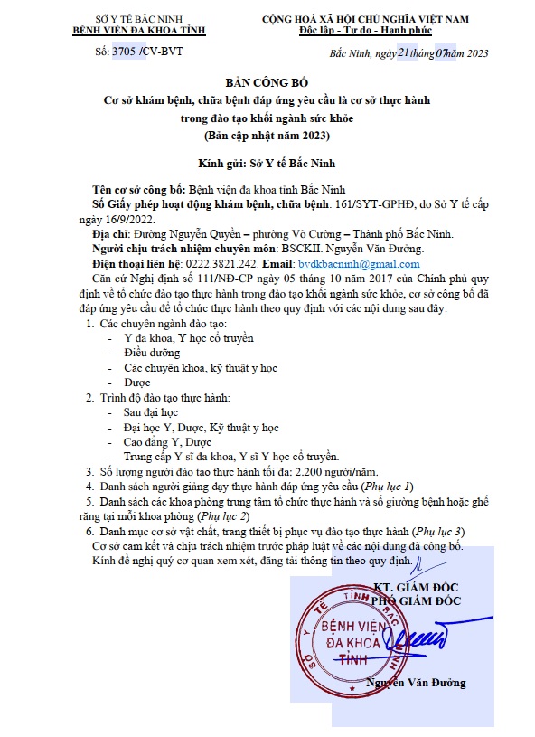 BẢN CÔNG BỐ: Cơ sở khám bênh, chữa bệnh đáp ứng yêu cầu là cơ sở thực hành trong đào tạo khối ngành sức khoẻ