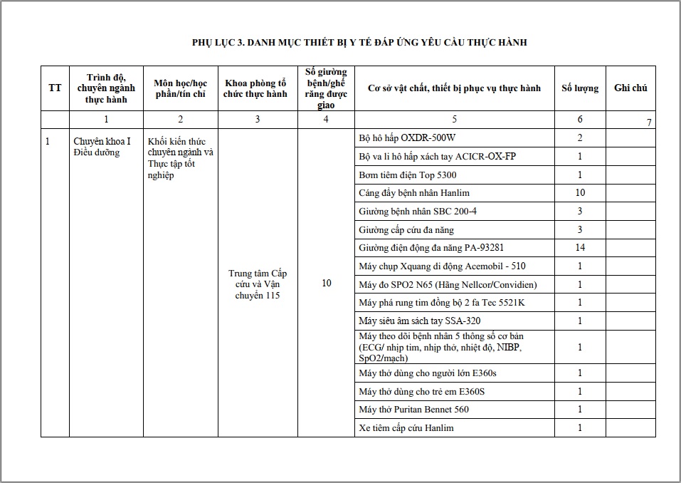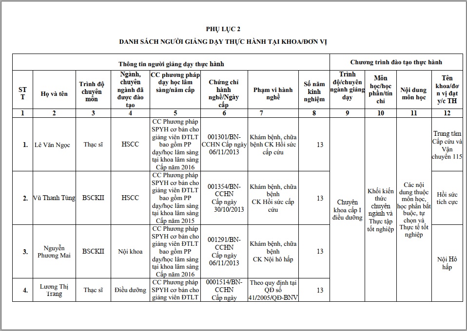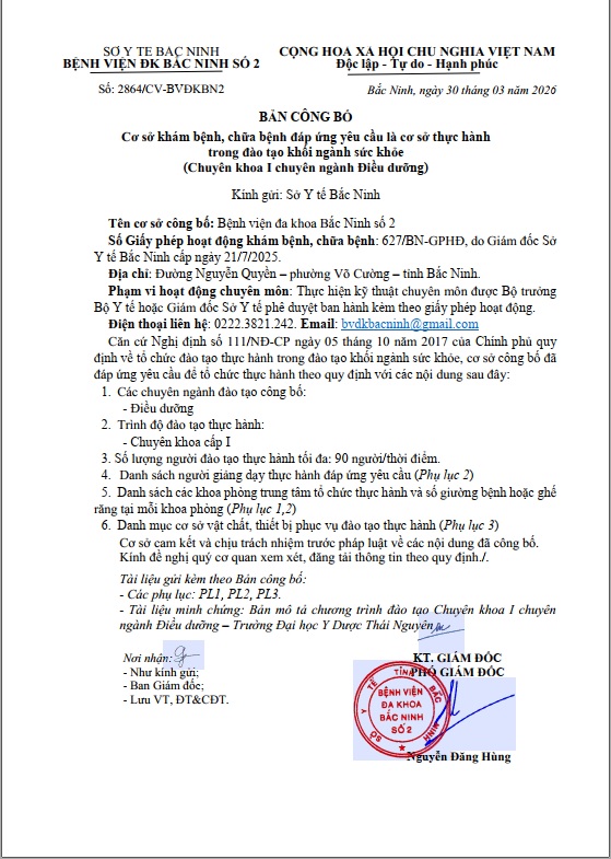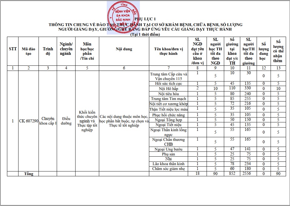 BẢN CÔNG BỐ CƠ SỞ KHÁM BỆNH, CHỮA BỆNH ĐÁP ỨNG YÊU CẦU LÀ CƠ SỞ THỰC HÀNH TRONG ĐÀO TẠO KHỐI NGÀNH SỨC KHỎE(CHUYÊN KHOA I CHUYÊN NGÀNH ĐIỀU DƯỠNG)