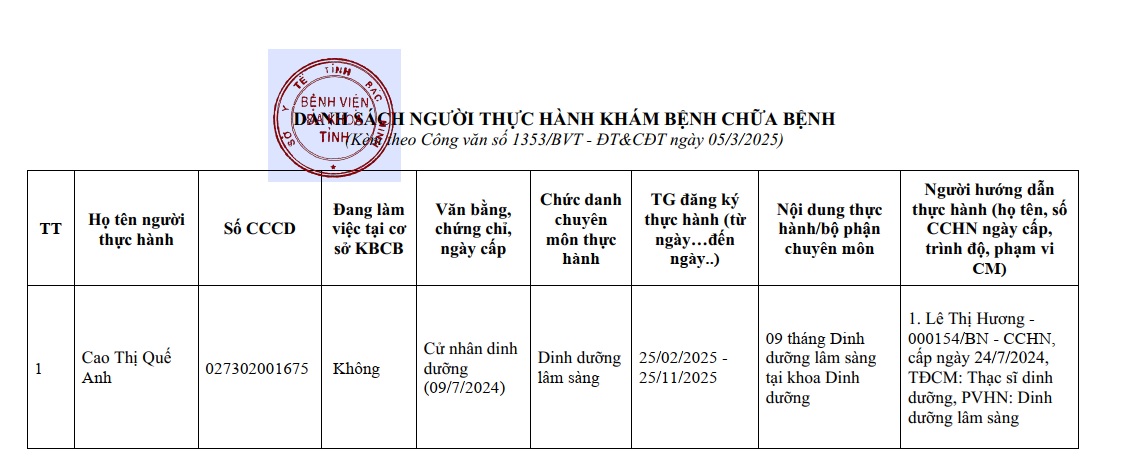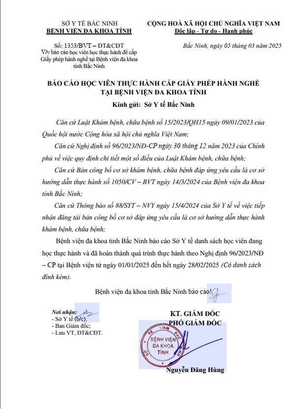 BÁO CÁO HỌC VIÊN THỰC HÀNH CẤP GIẤY PHÉP HÀNH NGHỀ TẠI BỆNH VIỆN ĐA KHOA TỈNH BẮC NINH SỐ 2