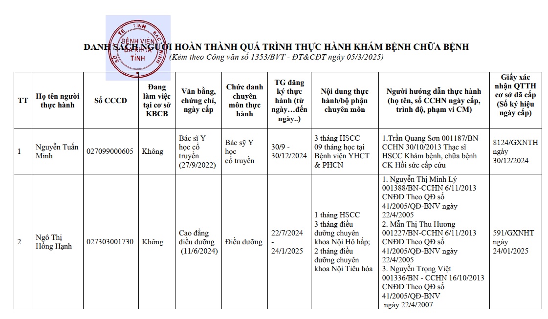 DANH SÁCH HOÀN THÀNH QUÁ TRÌNH THỰC HÀNH