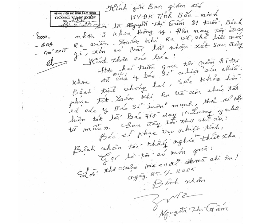 Ngày 25/4/2025, sau một thời gian điều trị tại khoa, bệnh nhân Nguyễn Thị Gấm – 81 tuổi đã hồi phục sức khỏe và viết lại những dòng thư tay đầy xúc động, gửi đến các y bác sĩ như một lời cảm ơn chân thành: