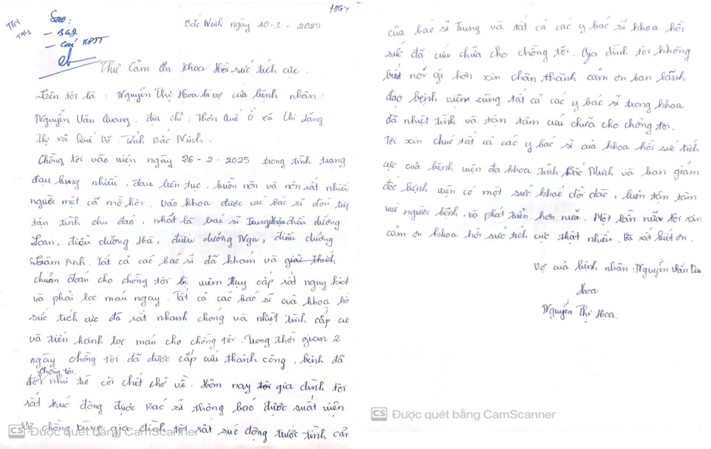 Bức thư của vợ bệnh nhân Nguyễn Văn Quang là một minh chứng đẹp đẽ cho sự đồng hành đầy cảm xúc giữa thầy thuốc và gia đình bệnh nhân: “Hôm nay gia đình tôi rất xúc động được bác sĩ thông báo được xuất viện. Vợ chồng cùng gia đình tôi rất xúc động trước tình cảm của bác sĩ Trung và tất cả các y bác sỹ khoa Hồi sức Tích cực đã cứu chữa cho chồng tôi. Gia đình tôi không biết nói gì hơn, xin chân thành cảm ơn ban lãnh đạo Bệnh viện cùng tất cả các y bác sĩ trong khoa đã nhiệt tình và tận tâm cứu chữa cho chồng tôi,….”