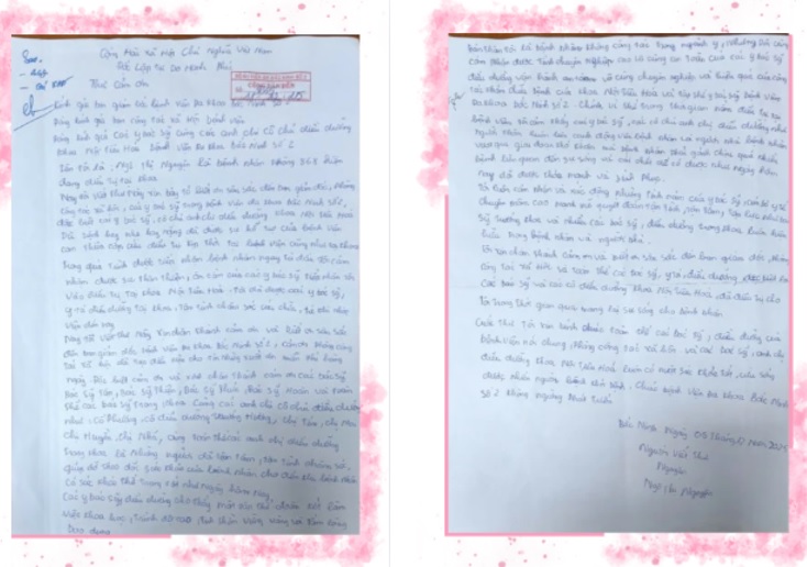 Đặc biệt, chị Nguyện dành nhiều tình cảm trân trọng cho tập thể Khoa Nội Tiêu hóa – nơi trực tiếp theo dõi, điều trị và chăm sóc sức khỏe cho chị. Theo chia sẻ trong thư, các bác sĩ và điều dưỡng của khoa luôn theo sát diễn biến bệnh, xử trí kịp thời, góp phần giúp chị từng bước ổn định thể trạng và cải thiện sức khỏe.