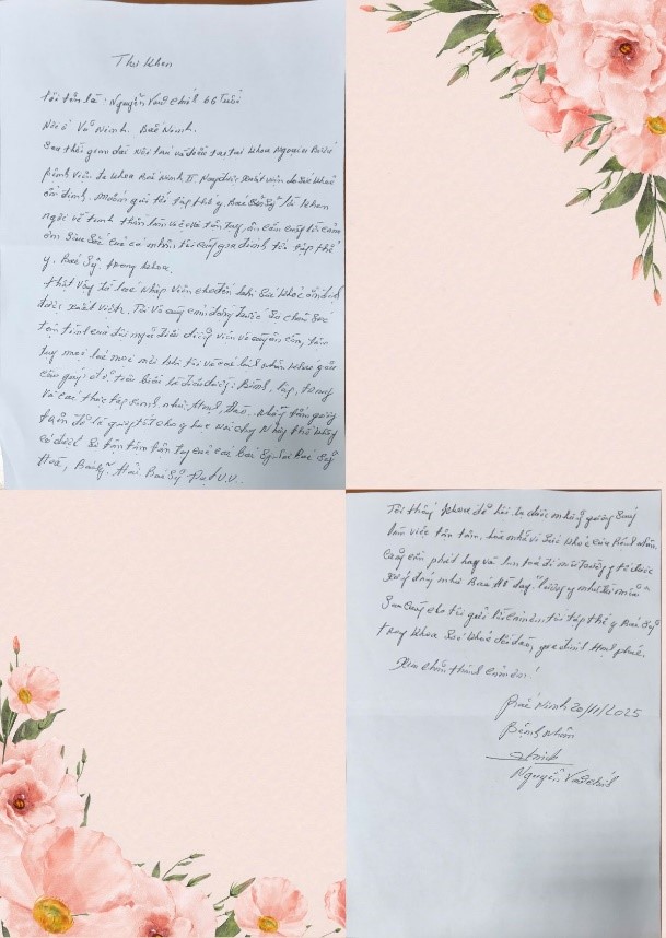 Phòng Công tác xã hội – Bệnh viện Đa khoa Bắc Ninh số 2 vừa trân trọng tiếp nhận một lá thư viết tay đầy xúc động của ông Nguyễn Văn Chính, 66 tuổi, trú tại Võ Ninh, Bắc Ninh. Sau quá trình điều trị và chăm sóc tại Khoa Ngoại Ung bướu, sức khỏe dần ổn định, ông Chính đã gửi gắm lòng biết ơn sâu sắc của mình qua những dòng chữ mộc mạc nhưng chan chứa tình cảm, gửi tới toàn thể đội ngũ y, bác sĩ của khoa..jpg)