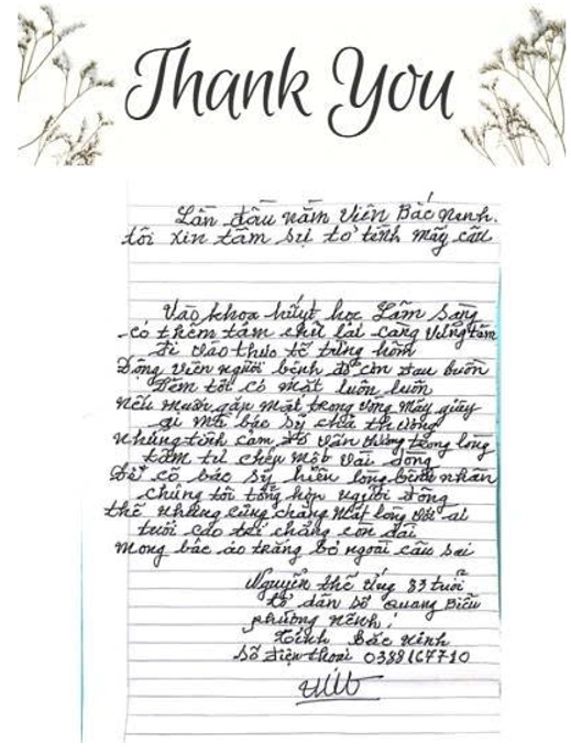 Bức thư của bệnh nhân là món quà tinh thần đầy ý nghĩa – không chỉ là lời cảm ơn dành riêng cho Khoa Huyết học lâm sàng, mà còn là sự ghi nhận quý giá đối với những người làm nghề y – những người lặng lẽ hy sinh vì người bệnh mỗi ngày.