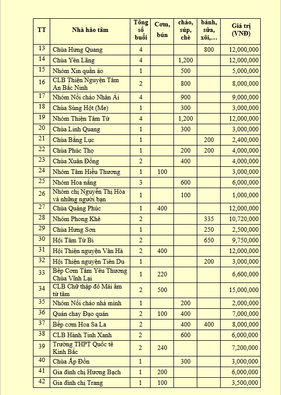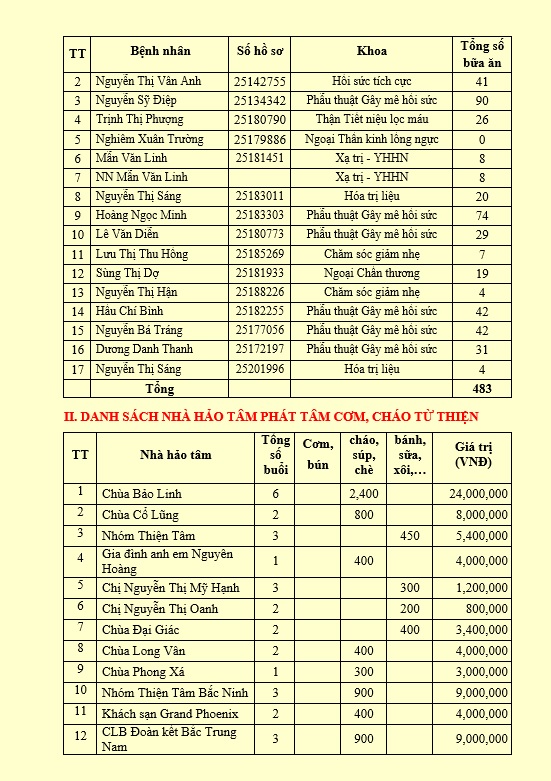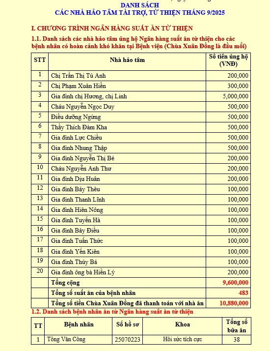 1. Chương trình Ngân hàng suất ăn từ thiện: Tổng số 17 lượt bệnh nhân có hoàn cảnh khó khăn đã được hỗ trợ 483 suất ăn tại Căng tin bệnh viện, tổng giá trị 10,880,000 đồng. Chùa Xuân Đồng là đầu mối tiếp nhận tài trợ từ 20 quý nhà hảo tâm với số tiền 9,600,000 đồng.