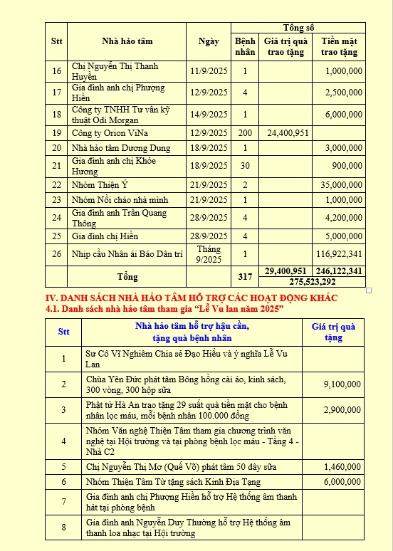 Trong tháng 9/2025, Phòng Công tác xã hội đã kết nối với các quý nhà hảo tâm thăm, động viên, trao tặng các suất ăn, suất quà miễn phí trực tiếp đến người bệnh đang điều trị tại bệnh viện, tổng giá trị ước đạt 779,252,692 đồng. Trong đó, các nhà hảo tâm trao tặng 257,022,341 đồng tiền mặt hỗ trợ các bệnh nhân có hoàn cảnh khó khăn tại Bệnh viện, cụ thể như sau: