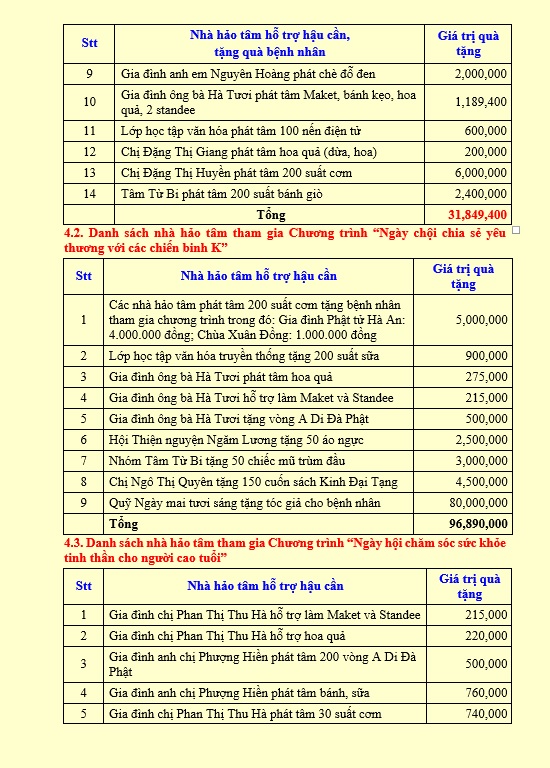 3. Tổ chức thăm hỏi, tặng quà, kêu gọi bệnh nhân bệnh nặng, có hoàn cảnh khó khăn: Phối hợp với 26 nhà hảo tâm trao tặng cho 317 lượt bệnh nhân, tổng giá trị trao tặng 275,523,292 đồng (trong đó trao tiền mặt 246,122,341 đồng, trao quà trị giá 29.400.951 đồng).