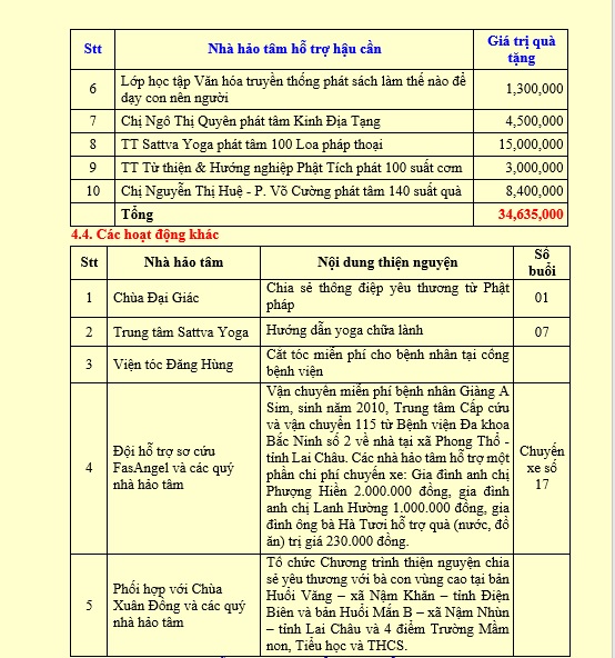 4. Các hoạt động khác: Hỗ trợ chuyến xe cứu thương vận chuyển bệnh nhân Giàng A Sim, sinh năm 2010, Trung tâm Cấp cứu và vận chuyển 115 từ Bệnh viện Đa khoa Bắc Ninh số 2 về nhà tại xã Phong Thổ - tỉnh Lai Châu, các nhà hảo tâm hỗ trợ một phần chi phí chuyến xe với số tiền 3.230.000 đồng. Tổ chức các chương trình: Lễ vu lan, Chia sẻ yêu thương với các chiến binh K, Ngày hội chăm sóc sức khỏe tinh thần cho người cao tuổi tại Hội trường 1, tầng 7 – C3, trong chương trình các bệnh nhân được nghe chia sẻ về đạo hiếu, chăm sóc sức khỏe tinh thần, trao tặng loa pháp thoại, kinh sách, vòng đeo tay, áo ngực cho bệnh nhân K vú, các phần quà... giá trị ước đạt 163.374.400 đồng. Tổ chức chương trình cắt tóc miễn phí cho bệnh nhân tại cổng bệnh viện. Tổ chức chương trình “Chia sẻ thông điệp yêu thương từ Phật pháp”. Tổ chức lớp hướng dẫn yoga chữa lành. Duy trì Tủ đọc sách báo miễn phí.