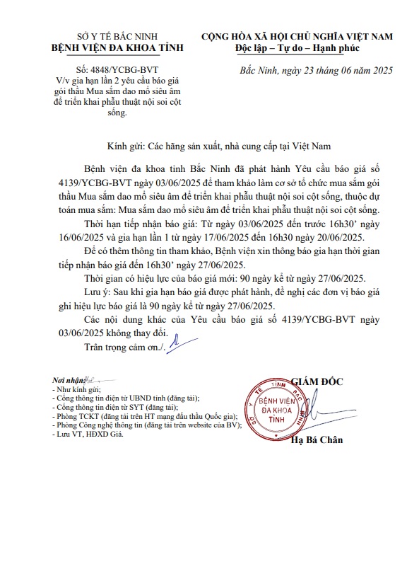 Gia hạn lần 2 yêu cầu báo giá gói thầu Mua sắm dao mổ siêu âm để triển khai phẫu thuật nội soi cột sống.