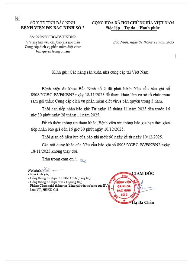 Gia hạn yêu cầu báo giá gói thầu Cung cấp dịch vụ phần mềm diệt virus bản quyền trong 3 năm