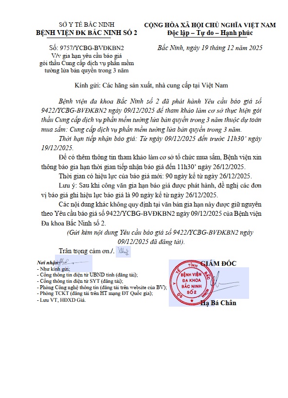 Gia hạn yêu cầu báo giá gói thầu Cung cấp dịch vụ phần mềm tường lửa bản quyền trong 3 năm