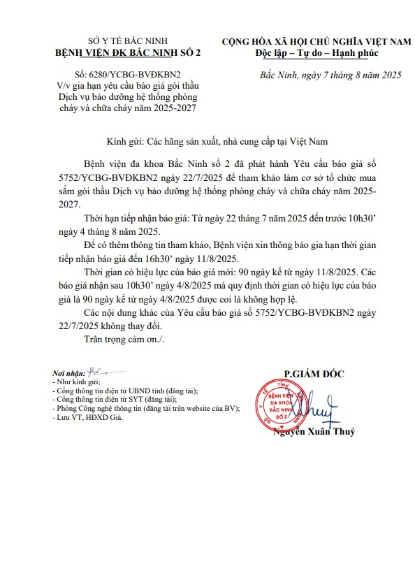 Gia hạn yêu cầu báo giá gói thầu Dịch vụ bảo dưỡng hệ thống phòng cháy và chữa cháy năm 2025-2027