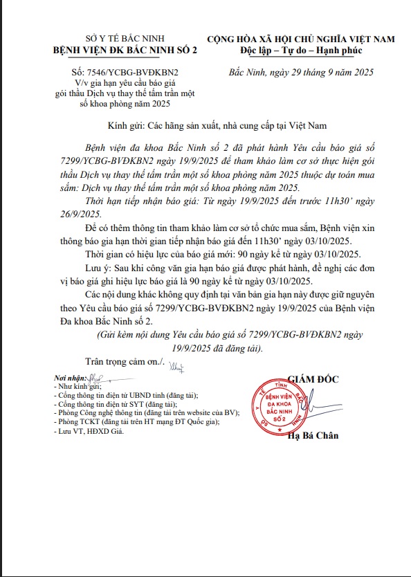Gia hạn yêu cầu báo giá gói thầu Dịch vụ thay thế tấm trần một số khoa phòng năm 2025