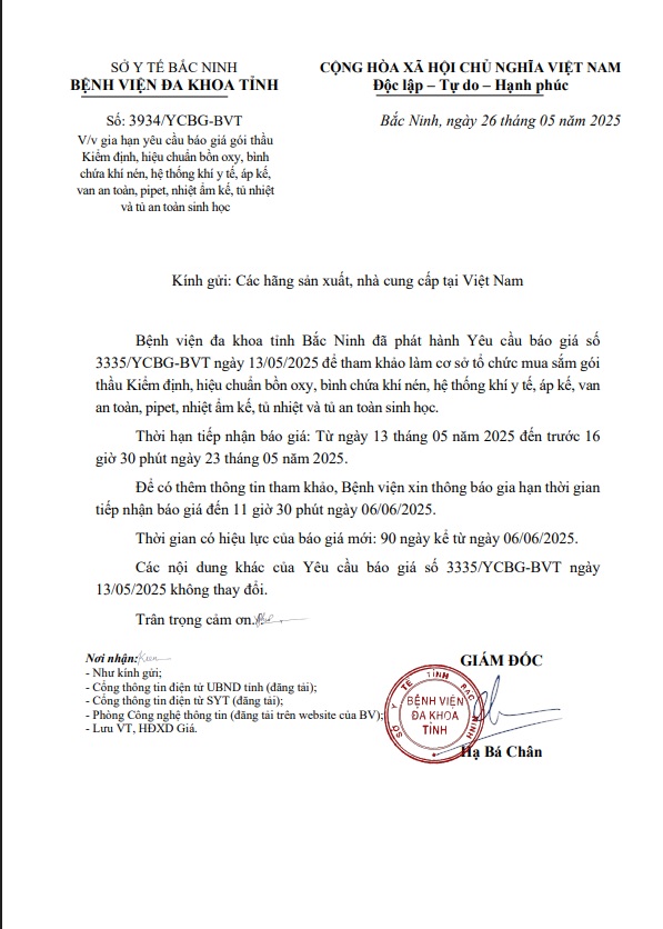 Gia hạn yêu cầu báo giá gói thầu Kiểm định, hiệu chuẩn bồn oxy, bình chứa khí nén, hệ thống khí y tế, áp kế, van an toàn, pipet, nhiệt ẩm kế, tủ nhiệt và tủ an toàn sinh học