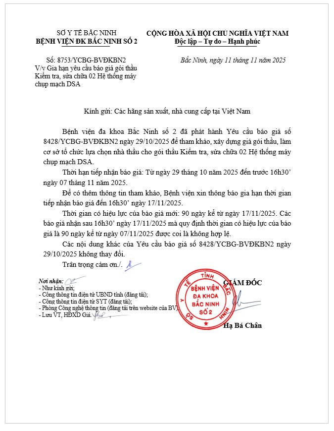 Gia hạn yêu cầu báo giá gói thầu Kiểm tra, sửa chữa 02 Hệ thống máy chụp mạch DSA