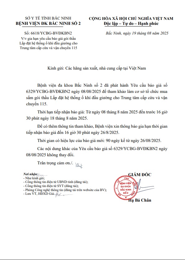 Gia hạn yêu cầu báo giá gói thầu Lắp đặt hệ thống ổ khí đầu giường cho Trung tâm cấp cứu và vận chuyển 115