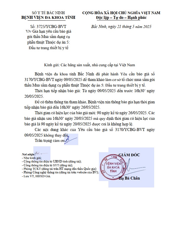 Gia hạn yêu cầu báo giá gói thầu Mua sắm dụng cụ phẫu thuật Thuộc dự án 5: Đầu tư trang thiết bị y tế