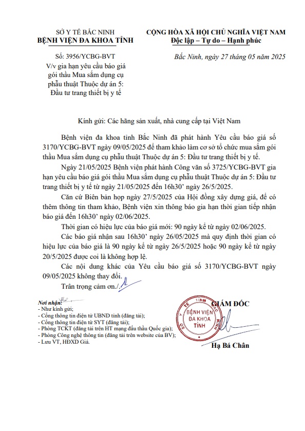 Gia hạn yêu cầu báo giá gói thầu Mua sắm dụng cụ phẫu thuật Thuộc dự án 5: Đầu tư trang thiết bị y tế