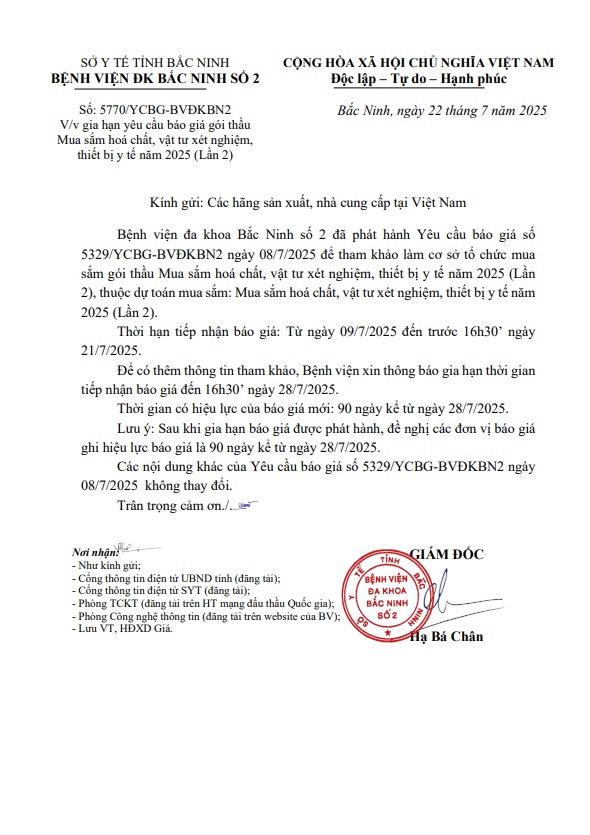 Gia hạn yêu cầu báo giá gói thầu Mua sắm hoá chất, vật tư xét nghiệm, thiết bị y tế năm 2025 (Lần 2)