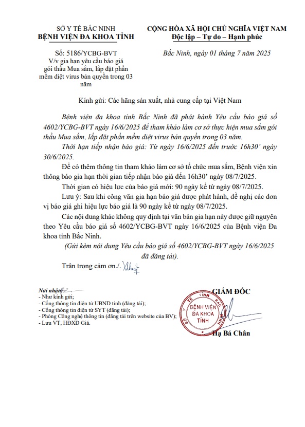 Gia hạn yêu cầu báo giá gói thầu Mua sắm, lắp đặt phần mềm diệt virus bản quyền trong 03 năm