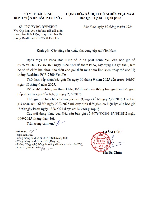 Gia hạn yêu cầu báo giá gói thầu mua sắm linh kiện, thay thế cho Hệ thống Realtime PCR 7500 Fast Dx.