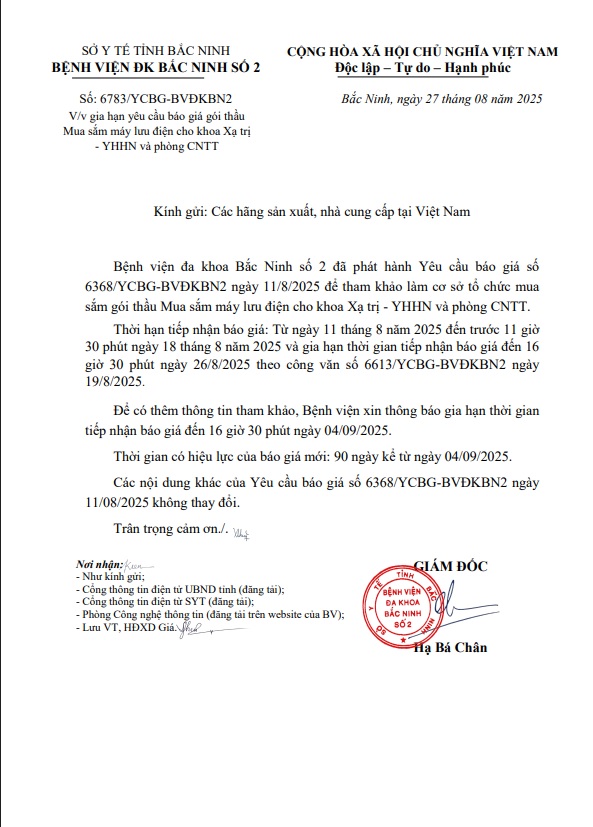 Gia hạn yêu cầu báo giá gói thầu Lắp đặt hệ thống ổ khí đầu giường cho Trung tâm cấp cứu và vận chuyển 115
