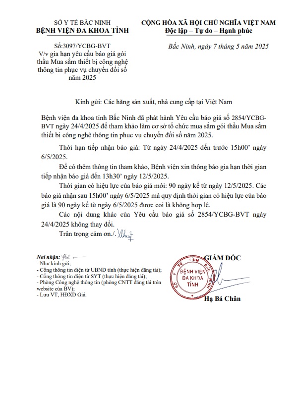 Gia hạn yêu cầu báo giá gói thầu Mua sắm thiết bị công nghệ thông tin phục vụ chuyển đổi số năm 2025