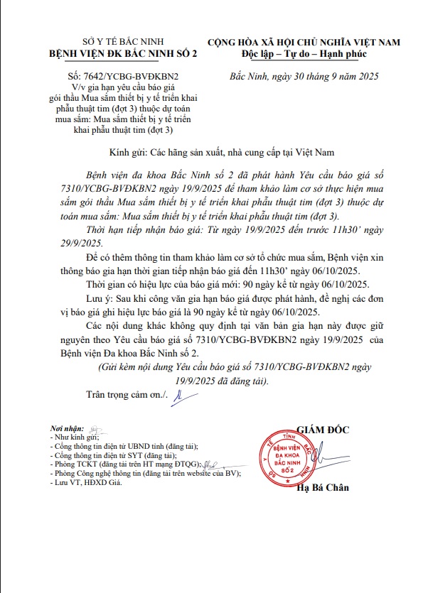 Gia hạn yêu cầu báo giá gói thầu Mua sắm thiết bị y tế triển khai phẫu thuật tim (đợt 3) thuộc dự toán mua sắm: Mua sắm thiết bị y tế triển khai phẫu thuật tim (đợt 3)