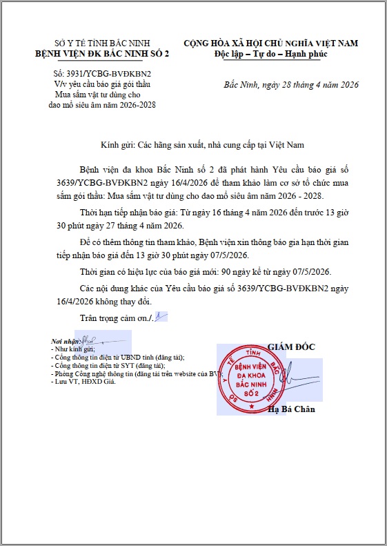 Gia hạn Yêu cầu báo giá gói thầu Mua sắm vật tư dùng cho dao mổ siêu âm năm 2026-2028