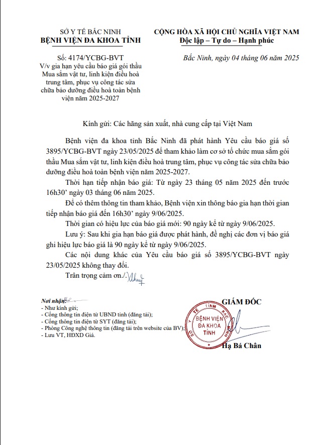 Gia hạn yêu cầu báo giá gói thầu Mua sắm vật tư, linh kiện điều hoà trung tâm, phục vụ công tác sửa chữa bảo dưỡng điều hoà toàn bệnh viện năm 2025-2027