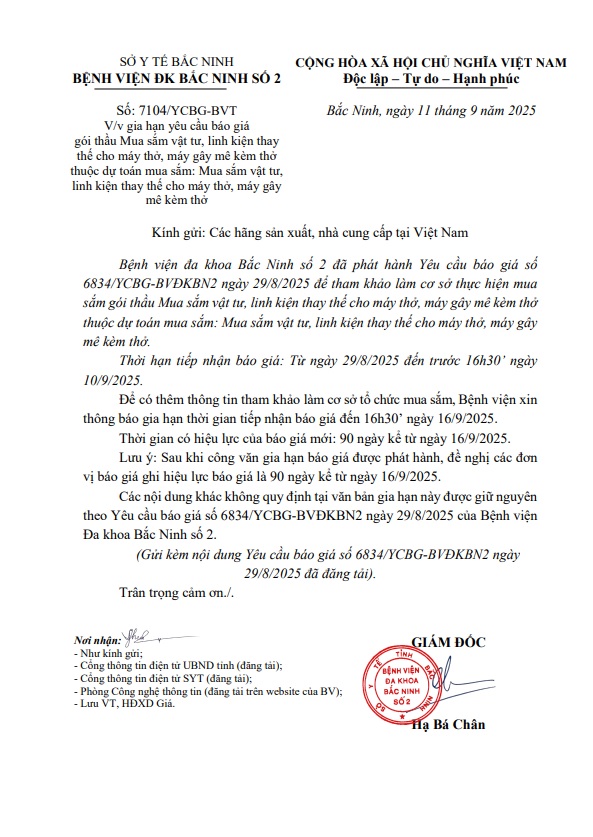 Gia hạn yêu cầu báo giá gói thầu Mua sắm vật tư, linh kiện thay thế cho máy thở, máy gây mê kèm thở thuộc dự toán mua sắm: Mua sắm vật tư, linh kiện thay thế cho máy thở, máy gây mê kèm thở