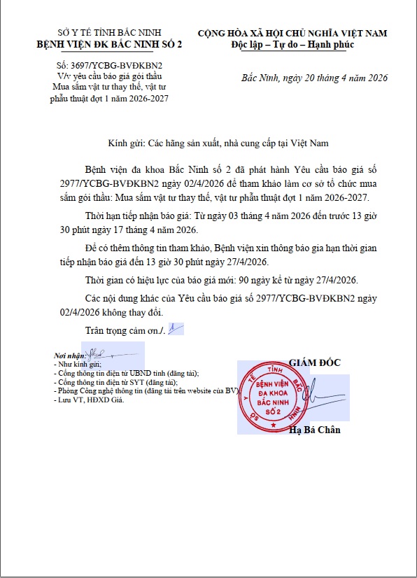 Gia hạn Yêu cầu báo giá gói thầu Mua sắm vật tư thay thế, vật tư phẫu thuật đợt 1 năm 2026-2027