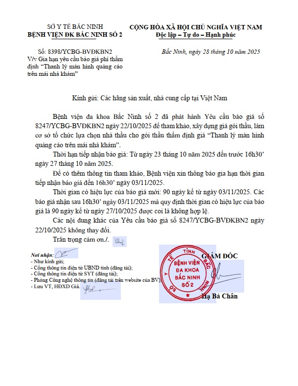 Gia hạn yêu cầu báo giá phí thẩm định “Thanh lý màn hình quảng cáo trên mái nhà khám”