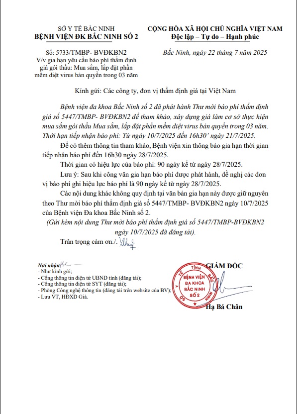 Gia hạn yêu cầu báo phí thẩm định giá gói thầu: Mua sắm, lắp đặt phần mềm diệt virus bản quyền trong 03 năm