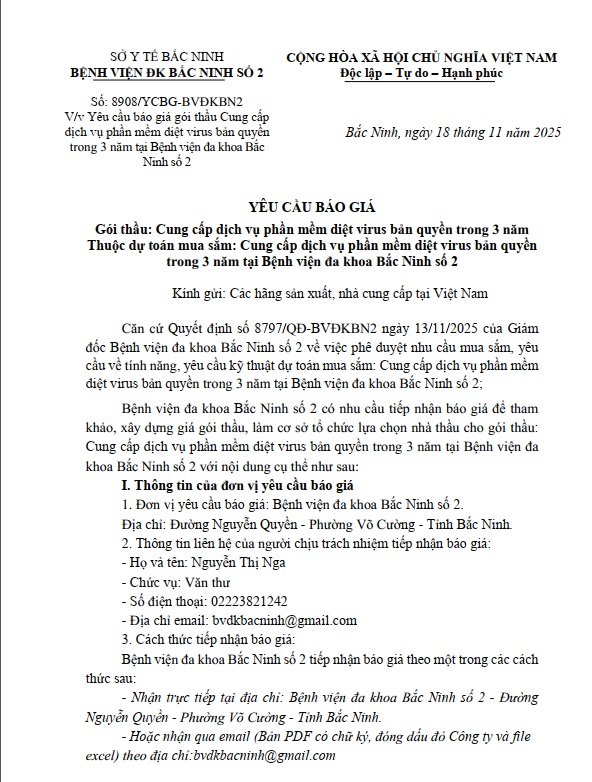 Gói thầu: Cung cấp dịch vụ phần mềm diệt virus bản quyền trong 3 năm Thuộc dự toán mua sắm: Cung cấp dịch vụ phần mềm diệt virus bản quyền trong 3 năm tại Bệnh viện đa khoa Bắc Ninh số 2
