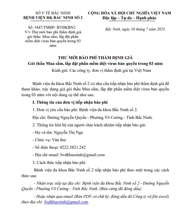 Thư mời báo phí thẩm định giá gói thầu: Mua sắm, lắp đặt phần mềm diệt virus bản quyền trong 03 năm