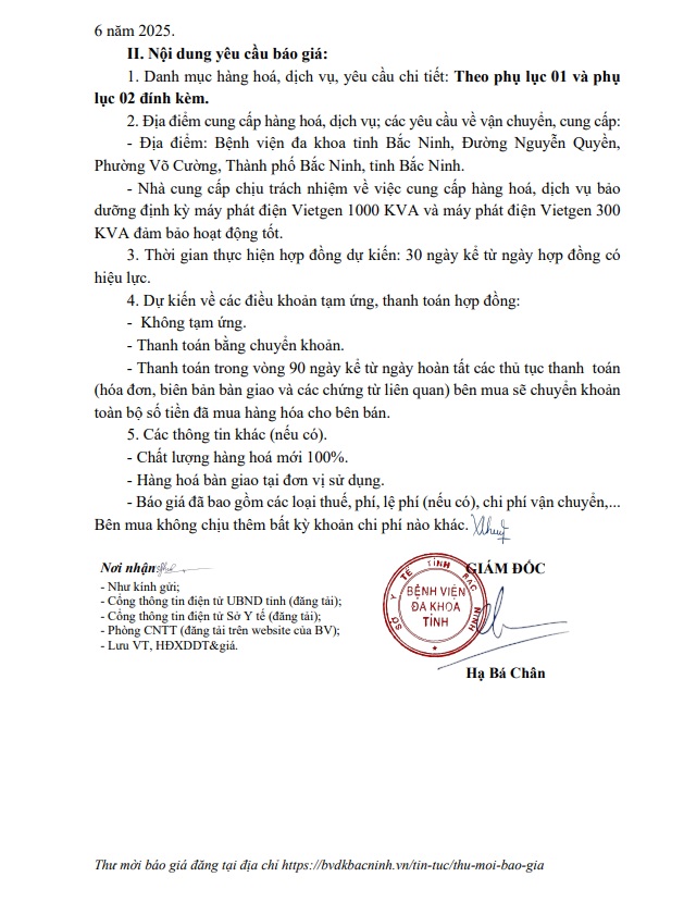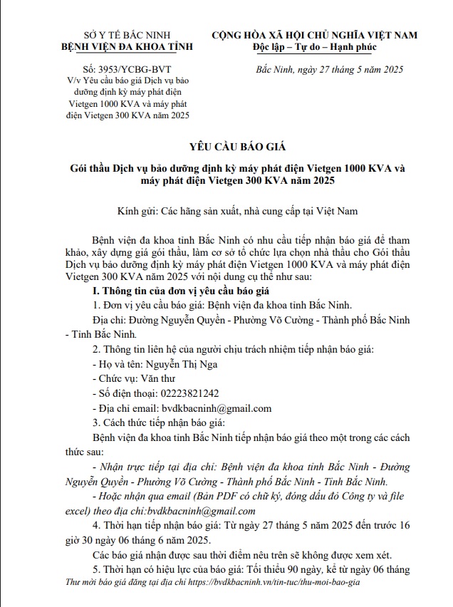 Yêu cầu báo giá Dịch vụ bảo dưỡng định kỳ máy phát điện Vietgen 1000 KVA và máy phát điện Vietgen 300 KVA năm 2025