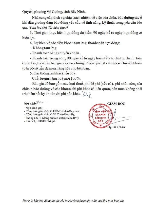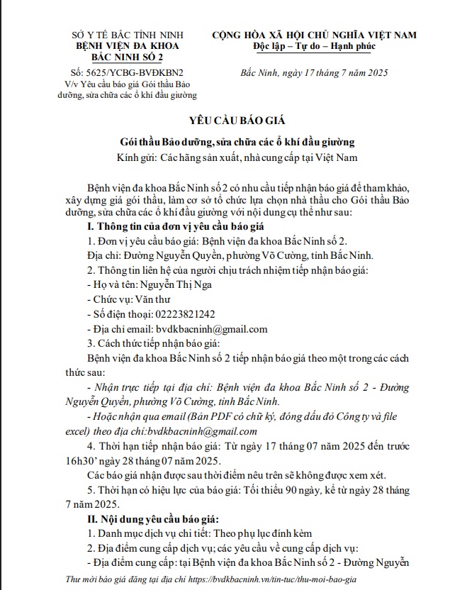Yêu cầu báo giá Gói thầu Bảo dưỡng, sửa chữa các ổ khí đầu giường