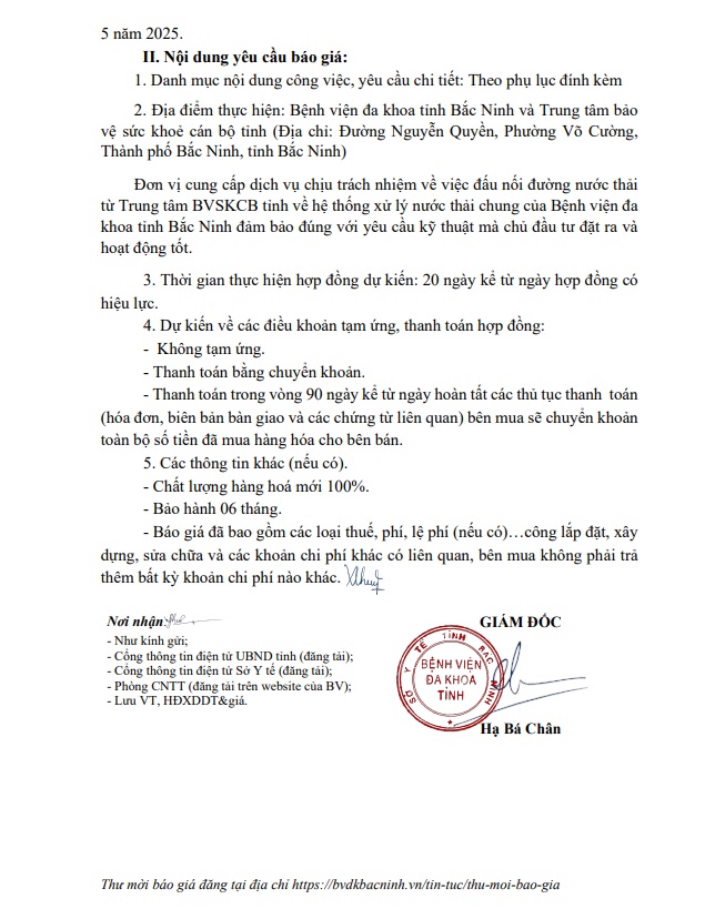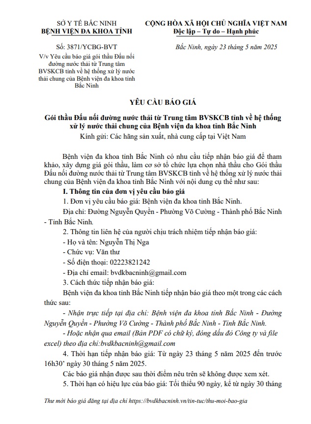 Yêu cầu báo giá gói thầu Đấu nối đường nước thải từ Trung tâm BVSKCB tỉnh về hệ thống xử lý nước thải chung của Bệnh viện đa khoa tỉnh Bắc Ninh
