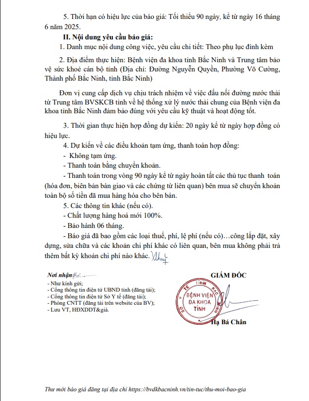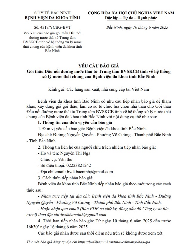 Yêu cầu báo giá gói thầu Đấu nối đường nước thải từ Trung tâm BVSKCB tỉnh về hệ thống xử lý nước thải chung của Bệnh viện đa khoa tỉnh Bắc Ninh