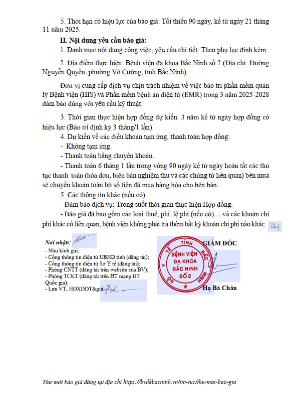Yêu cầu báo giá gói thầu Dịch vụ bảo trì phần mềm quản lý Bệnh viện (HIS) và Phần mềm bệnh án điện tử (EMR) trong 3 năm 2025-2028
