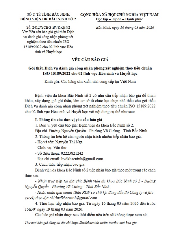 Yêu cầu báo giá Gói thầu Dịch vụ đánh giá công nhận phòng xét nghiệm theo tiêu chuẩn ISO 15189:2022 cho 02 lĩnh vực Hóa sinh và Huyết học